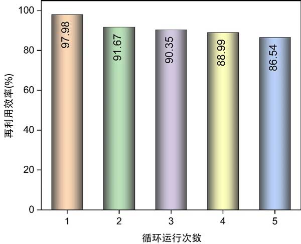 吸附劑的可重復(fù)使用性和吸附穩(wěn)定性在評(píng)估所開(kāi)發(fā)方法的實(shí)際適用性方面起著至關(guān)重要的作用。事實(shí)上,吸附劑的可重復(fù)使用性能是實(shí)際應(yīng)用的首要標(biāo)準(zhǔn),并影響吸附過(guò)程的總體成本;钚蕴勘秸羝降脑倮眯适窃谖鍌(gè)連續(xù)的回收循環(huán)后確定的。如圖4所示,經(jīng)過(guò)五次連續(xù)回收過(guò)程后,活性炭苯蒸氣的再利用效率為86.54%。強(qiáng)大的可重復(fù)使用性和吸附穩(wěn)定性表明活性炭吸附劑和苯吸附物之間存在范德華力或π-π相互作用。相反,不完全的再生過(guò)程可歸因于吸附表面上永久鍵的形成,導(dǎo)致吸附基團(tuán)的不可逆轉(zhuǎn)化。換句話(huà)說(shuō),一些在再生過(guò)程中未解吸的化學(xué)結(jié)合吸附物可能會(huì)堵塞孔隙,導(dǎo)致殘留物形成。