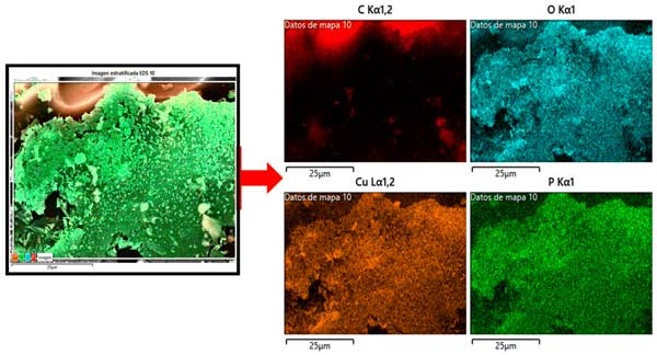 圖1:浸漬氧化銅的活性炭的FESEM圖像對應(yīng)的元素映射分析。