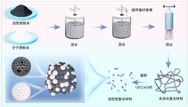活性炭之所以特別適合用于吸附過(guò)程,是因?yàn)樗哂懈叨榷嗫椎臒o(wú)定形結(jié)構(gòu),能夠吸附各種分子。它具有微孔和中孔,可以容納各種大小的分子,補(bǔ)充了分子篩的孔隙特異性;钚蕴窟具有利用功能基團(tuán)改變其表面化學(xué)性質(zhì)的潛力,從而增強(qiáng)其與目標(biāo)分子的相互作用。本文以羧甲基纖維素為黏合劑,通過(guò)機(jī)械混合和擠出法制備了一系列 華活性炭分子篩復(fù)合材料(圖1)。