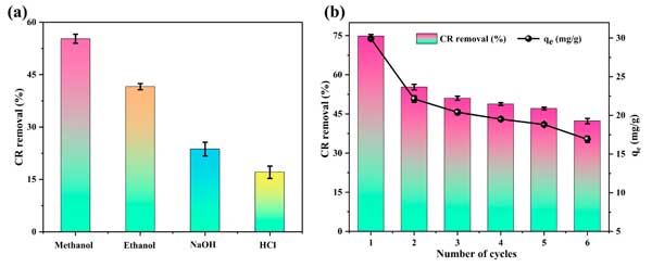 在圖4a中描述的解吸實驗證明了溶劑類型對從支出的活性炭中去除CR的顯著影響。溶劑按降低的解吸效率順序為甲醇>乙醇>NaOH>HCl,其去除效率分別為55.28%,41.56%,23.66%和17.06%。與乙醇相比,甲醇的出色性能是由于其較低的分子量和較短的烴鏈。這些特性可能有助于更有效地滲透到活性炭的孔中,從而破壞CR-活性炭相互作用。此外,其較高的極性大概有助于破壞非共價相互作用,例如氫鍵或范德華力。相反,對NaOH和HCl觀察到的較低的解吸效率表明,強堿或酸不容易逆轉(zhuǎn)CR-活性炭的吸附。這可能是由于較大離子物種的孔穿透有限,可能受到空間效應(yīng)或擴散屏障的阻礙,或者是由于與Cr反應(yīng)后保留在孔中保留的不溶性沉淀物的形成。因此,選擇甲醇作為再生研究的解劑溶劑。