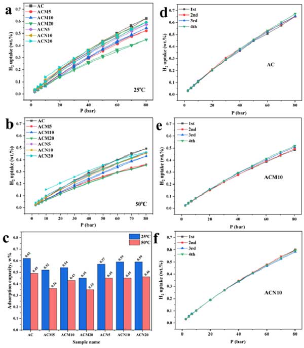 在25℃和50℃兩個(gè)溫度下,測定各樣本在0–80bar下的氫氣吸附–脫附等溫線,并從中提取最大吸附量。主要結(jié)果如下: