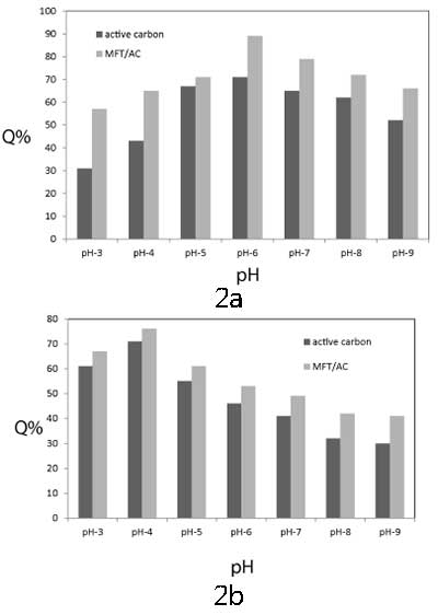 初始pH的影響:初始pH對鉻和鋅離子的去除效率的影響在pH(3-9)的范圍內(nèi)進(jìn)行研究,并在(圖2a和2b)中表示。通過在含有50mL初始濃度為100mg / L的50mL重金屬溶液的燒杯中,將0.05g MFT/活性炭或活性炭浸泡在25℃下,并且以210KHz聲強(qiáng)度,以7.7W /厘米1小時。如圖2所示,由于pH影響金屬離子和MFT官能團(tuán)的化學(xué)性質(zhì),MFT / 活性炭從水溶液中去除中的金屬離子是pH依賴性過程。在所有pH值范圍內(nèi),MFT / 活性炭的去除系數(shù)大于活性炭的去除系數(shù)。對于鉻離子,去除Cr 3+的系數(shù)離子從pH3增加到6,在pH6達(dá)到最大值。在pH = 6時,約91%的鉻離子從溶液中去除。在pH范圍(7 - 9),去除系數(shù)略有下降。對于鋅離子,去除系數(shù)在pH4時達(dá)到最大值,鋅離子去除率達(dá)到74%,然后明顯下降。在中性或微酸性介質(zhì)中,吸收可能是由于樹脂 - 金屬離子絡(luò)合物的穩(wěn)定形成,由于配位羧酸根釋放H+,可能導(dǎo)致介質(zhì)酸度增加。在較高的pH值下,重金屬離子將水解成Cr(OH)+和Zn(OH)+,因此,重金屬正電荷減少到+1,這使得與螯合劑的低相互作用除了金屬氫氧化物可以沉淀。