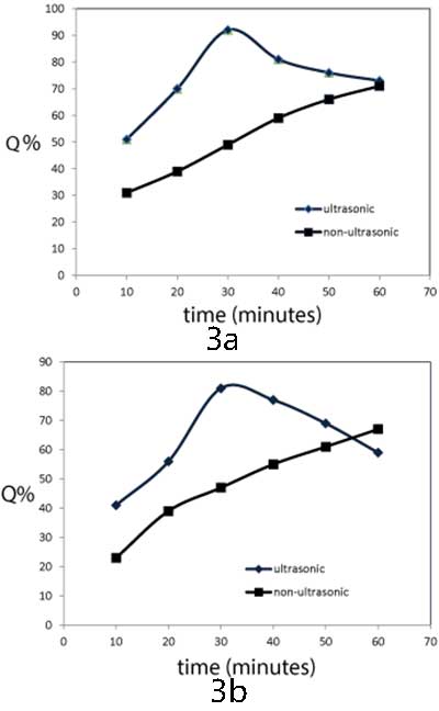 在沒有超聲波的情況下,MFT / 活性炭對兩種重金屬的去除系數(shù)隨著去除時間的增加而連續(xù)增加,并且在去除過程60分鐘后,大約71%的Cr離子和60%的Zn離子被去除。當(dāng)超聲波在除去過程中使用時,對于兩種重金屬,去除系數(shù)隨著超聲處理時間的增加而增加,在0-30分鐘范圍內(nèi),對于鉻離子為92%,對于鋅離子為81%,參見(圖3a和圖3b)圖3b)。在超聲處理(40-60分鐘),去除系數(shù)大大變得相當(dāng)于非超聲波解決方案(鉻)和低于非聲波解決方案(鋅)獲得的。在較早的超聲波處理時間內(nèi),借助超聲波減壓,MFT與重金屬的配位作用增強(qiáng)。而隨后的超聲處理時間(從30-60分鐘),由于超聲波的劇烈效應(yīng),溶液中產(chǎn)生的高壓和高溫可降低MFT的粒徑。這減少了金屬離子和MFT之間已經(jīng)形成的螯合鍵的可能的螯合和破壞,MFT負(fù)責(zé)減少重金屬離子的去除。