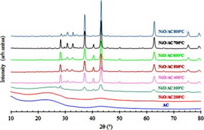 由活性炭和活性炭負(fù)載的鎳在不同的熱處理溫度下記錄的X射線衍射圖如圖1 所示。在200中被加熱的樣品 ℃,在2θ顯示有2個(gè)衍射峰 = 23.5和43.5°,對應(yīng)于(0 0 2),(1 0 無定形活性炭0)指數(shù)平面。另外,隨著煅燒溫度從300 ℃ 升高到800 ℃ ,反射次數(shù)增加,表明添加的催化劑在2θ = 37.1°,43.2°,62.7°和75.3° 處被氧化成氧化鎳 。這些角度分配給(1 1 1),(2 0 0),(2 2 0)和(3 1 1)面,立方晶體的氧化鎳。此外,對于400-800 ℃ 煅燒的樣品,在對應(yīng)于(2 2 2)的2θ = 79.3° 處觀察到新的峰。氧化鎳峰的強(qiáng)度也隨著煅燒溫度的增加而增加。