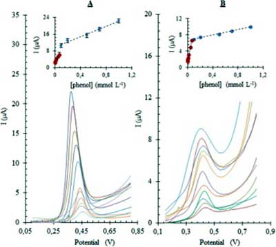 圖2、使用DPV方法在的氧化鎳活性炭自來水中(A)和橄欖油(B)樣品的苯酚校準(zhǔn)曲線改性的碳電極在1.0的濃度范圍 × 10 -6 mol L−1至1.0 × 10 -3 mol L−1。