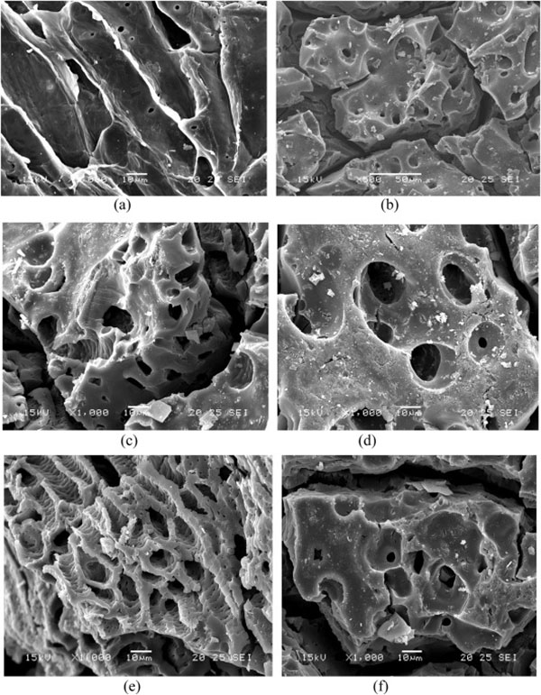 圖1。SEM顯微照片(×1000放大倍數(shù))(a)植物種子(b)活性炭1(c)活性炭2(d)活性炭3(e)活性炭4(f)活性炭5。