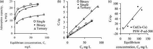 圖2.初始pH值為5的活性炭的三元溶質(zhì),Cu(II),Ni(II)和Pb(II)的Langmuir非線性(a),線性(b)和Freundlich(c)等溫線而它們的初始濃度變化,從<0到≤600mg L-1。(分析Ni樣品的濃度范圍高達(dá)305mg L -1)。