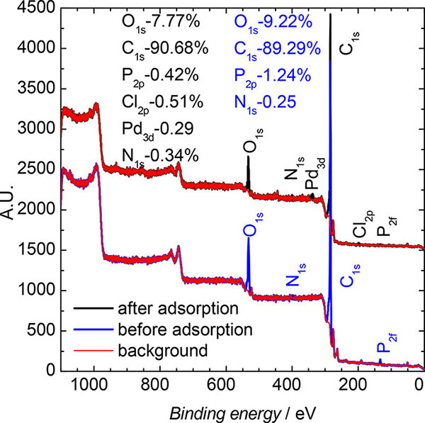 吸附過程之前和之后材料的完整XPS光譜如圖2所示?紤]到觀察到的溶液中Pd(II)濃度的降低,估計鈀負(fù)載等于0.7%(m/m)?梢钥闯鰜碜遭Z的峰出現(xiàn)。對這個峰值進(jìn)行更深入的分析可以為我們提供有關(guān)鈀電子結(jié)構(gòu)的信息。
