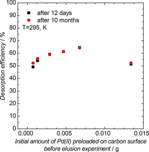 在活性炭表面存在二氯化鈀的情況下,應(yīng)該可以根據(jù)方程解吸它。因此,解吸試驗在室溫(20℃)進(jìn)行,使用100厘米3鹽酸(濃度為1mol·kg-1)或100厘米3的高氯酸鹽酸(濃度1mol.kg-1)。必須提及的是,吸附實驗在pH等于1下進(jìn)行,而汽提過程在pH等于0下進(jìn)行。由鈀(II)負(fù)載的活性炭樣品取自先前的吸附實驗。通過過濾將預(yù)加載的活性炭與溶液分離,然后在60℃下干燥。接著,將干燥的預(yù)加載的活性炭與鹽酸溶液混合。解吸試驗進(jìn)行約10個月。在前2天,觀察到溶液中鈀(II)濃度的快速增加,最終在12天后獲得恒定值。這些結(jié)果如圖4所示作為黑色方塊。為了確保這確實是最終的平衡,樣品在接下來的10個月內(nèi)留在溶液中。在此時間之后獲得的值顯示為紅點。過量的鹽酸是顯著的,它應(yīng)該足以溶解二氯化鈀。結(jié)果表明,平衡狀態(tài)不受時間影響,表明觀察到的狀態(tài)是最終狀態(tài)。似乎在該實驗期間,只有約50-65%的鈀(II)物質(zhì)可以從活性炭表面洗脫。如上所述,施加過量的鹽酸。因此,一方面,不完全洗脫可以通過Pd2 OCl2的形成來解釋或活性炭表面上的另一種鈀(II)化合物。另一方面,它可能僅僅與出現(xiàn)與初始狀態(tài)不同的新平衡狀態(tài)有關(guān)。為了切斷推測,進(jìn)行簡單的第二次解吸試驗,其中使用來自第一次解吸試驗的活性炭。實驗條件和程序與第一次解吸試驗期間的相同。觀察到鈀(II)的洗脫再次發(fā)生。在最初的24小時后,高達(dá)17%的剩余鈀(II)被解吸,而在2個月后,總解吸效率達(dá)到98.4%的水平。