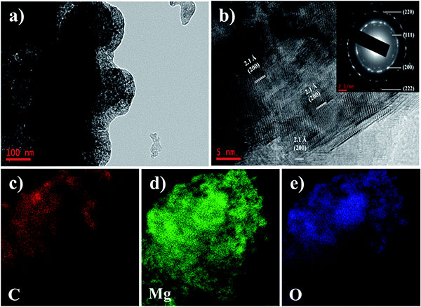 為了進一步揭示改性活性炭的微觀結構,我們進行了TEM,選擇區(qū)域電子衍射(SAED)和能量色散譜(EDS)測量。由于所有樣品具有相似的形態(tài),因此選擇活性炭中氧化鎂含量10%的樣品作為典型實例。TEM圖像(參見圖2a)顯示樣品由許多小的氧化鎂納米晶體和碳基質組成。圖2b顯示改性活性炭的HR-TEM圖像。層間距為2.1的氧化鎂晶格條紋歸因于立方氧化鎂的(200)晶格面。相應樣品的SAED圖案(圖2b的插圖)顯示明亮的圓圈環(huán),表明所選區(qū)域中氧化鎂的多晶性質。分配給氧化鎂的(111),(200),(220)和(222)反射的衍射同心環(huán)是明顯的,并且結果與從XRD數據獲得的氧化鎂平面一致。如圖2c-e所示,EDS映射結果表明鎂和氧元素均勻分布在活性炭表面而不是明顯的聚集。