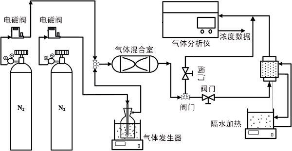 活性炭丙酮吸附實驗系統(tǒng)如圖3所示。丙酮突破實驗在裝有水套的玻璃管柱中進行,以保持25℃的恒定溫度。氮氣系統(tǒng)由兩部分組成并由質量流量控制器控制,一個分支通過丙酮氣體發(fā)生器獲得的高濃度蒸汽。同時,為了調節(jié)丙酮蒸氣的濃度,氮氣通過另一個分支進入氣體混合室稀釋高濃度丙酮蒸氣。隨后,將氣態(tài)混合物在25℃恒定溫度和大氣壓下引導到活性炭上。通過氣相色譜儀在線監(jiān)測氣體經過活性炭的輸出濃度。