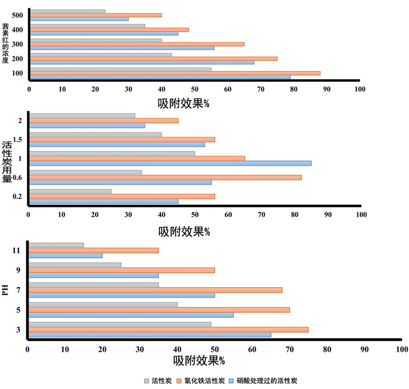 XRD圖和SEM對處理過的活性炭和氧化鐵活性炭納米復(fù)合物在呈現(xiàn)圖1;贐ET,活性炭的表面積,處理過的活性炭和氧化鐵活性炭被發(fā)現(xiàn)是389米2/g時(shí),550米2/g,并且400米2/g。圖2示出了活性炭混合溶液的pH值,處理過的活性炭和氧化鐵活性炭對茜素紅吸的效果。研究結(jié)果表明,pH的零電荷點(diǎn)值為6.5。并且示出了三種活性炭吸附劑的劑量對茜素紅吸附的效果。還描繪了三種活性炭的初始濃度對茜素紅吸附影響。