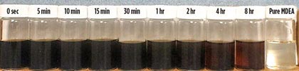 圖4顯示與含有含有活性炭8小時(shí)的MDEA的小瓶相比,不含活性炭的受污染的MDEA的顯著顏色變化。這很可能是因?yàn)榛钚蕴课搅穗s質(zhì)并澄清了MDEA溶液。還觀察到粘度變化但未測量。