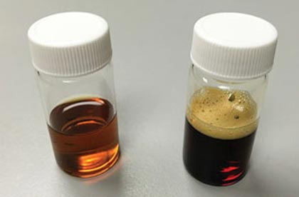 圖4.左小瓶經(jīng)過活性炭過濾。右小瓶未經(jīng)過活性炭其中的泡沫穩(wěn)定長達(dá)4小時(shí)。