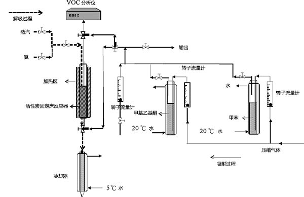 在稱重后將活性炭重新安裝到反應(yīng)器中。然后將閥門切換到解吸過(guò)程。將冷卻器的溫度設(shè)定為5℃,并加熱加熱帶直至達(dá)到解吸介質(zhì)的所需溫度(100℃或130℃)。解吸時(shí)間為10分鐘。當(dāng)反應(yīng)器的中心達(dá)到約35℃時(shí),將解吸介質(zhì)引入反應(yīng)器中。然后收集解吸的溶劑。當(dāng)滿足設(shè)定的解吸時(shí)間時(shí),終止加熱和解吸介質(zhì)并且溫度開(kāi)始下降。此后,將吹掃的壓縮空氣注入(在某些實(shí)驗(yàn)測(cè)試中使用氮?dú)?到反應(yīng)器中,直到中心溫度降至室溫。收集解吸的溶劑并稱重用于計(jì)算活性炭的工作容量。工作容量定義為吹掃后飽和VOC吸附容量與碳上殘余VOC的差值。然后使用氣相色譜儀分析溶劑的組成。