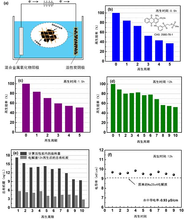 裝載RB19的活性炭在不同時間(例如,0.5小時,1.5小時和12小時)再生。還進(jìn)行了連續(xù)吸附-再生循環(huán)。如在介紹圖1的B-d,再生效率(RE)高達(dá)84.1%,83.4%,和88.7%的下分別為0.5小時,1.5小時,和12個小時,再生時間來實現(xiàn),這表明(該方法的有效性圖1a顯示了方法的示意圖)。然而,在5次吸附-再生循環(huán)后,0.5小時的再生時間導(dǎo)致<50%RE,而1.5小時的再生時間略高于50%RE。最重要的是,12小時的再生時間顯著改善了循環(huán)性能;馗布词乖10個循環(huán)后仍可達(dá)到52.3%(圖1d)。這些結(jié)果與上電化學(xué)方法等的研究,其表明相一致,即較長的再生時間導(dǎo)致較高的RE。表明該方法可以回收一些活性炭的孔隙體積。