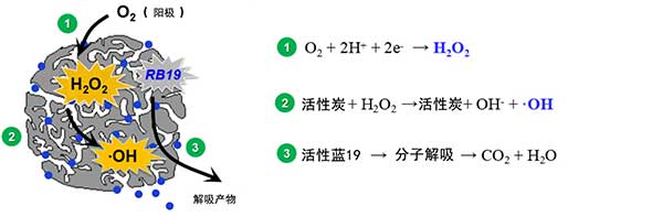 該方法的關(guān)鍵特征之一是沒有氧化劑或催化劑外部添加到系統(tǒng)中。過氧化氫電生成和OH生成都發(fā)生在負(fù)極化的活性炭上。因此,RB19分子,過氧化氫分子和OH自由基處于相同位置(活性炭的孔隙和表面),這有利于短壽命OH的RB19裂解。擴(kuò)大此流程的關(guān)鍵是活性炭與當(dāng)前不銹鋼網(wǎng)保持良好可靠的聯(lián)系。這種方法可以將吸附于活性炭內(nèi)的分子去除,再生活性炭的吸附能力,是一種比較好的活性炭再生方法。