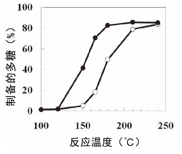 將含有或不含活性炭的葡萄糖漿在各種溫度下加熱30分鐘(圖2)。從100℃至120℃,觀察到多糖難消化部分的含量幾乎沒有增加。含有和不含活性炭的多糖難消化部分的含量在150℃下為41.4%和4.9%。在120至180℃下,在活性炭存在下不可消化部分的含量顯著增加。在高于180℃的溫度下,難消化部分的產(chǎn)生是恒定的。因此,當加熱溫度高時,可以在短時間內(nèi)達到目標產(chǎn)率。在設計制造過程時,反應溫度和時間的平衡很重要。