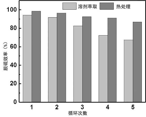 在吸附脫硫中使用的各種方法中,溶劑萃取和熱處理被認(rèn)為是常用的再生方法。在這項(xiàng)實(shí)驗(yàn)中,溶劑萃取和熱處理都用于研究活性炭的再生性能。關(guān)于溶劑萃取方法,在第一次吸附循環(huán)完成后,通過外部磁體收集活性炭,并通過添加甲醇作為萃取溶劑進(jìn)行洗滌。然后,將活性炭干燥用于下一次運(yùn)行。如在示出的圖3,它被發(fā)現(xiàn)的活性炭可在前兩次運(yùn)行時通過溶劑洗滌輕松再生。這可能是因?yàn)槲锢砦皆谖竭^程中占主導(dǎo)地位,并且由污染引起的大多數(shù)失活吸附劑可以通過溶劑萃取方法在初始循環(huán)中再生。然而,在連續(xù)五次再生操作后,吸附劑與新鮮吸附劑保持67%的初始脫硫效率(相當(dāng)于20.22mg DBT/g)。隨著循環(huán)次數(shù)的增加,活性更高的位點(diǎn)與DBT相互作用,并且后一次運(yùn)行留下的活性位點(diǎn)更少,從而導(dǎo)致隨后的再生運(yùn)行中脫硫效率降低。為了提高活性炭吸附劑的再生效果,引入了熱處理方法。通過溶劑萃取再生后,將獲得的活性炭在氮?dú)夥障略?50℃下活化1小時來恢復(fù)活性。