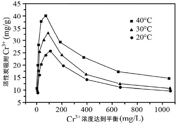 2、已經(jīng)確定,活性炭在20、30和40℃下的鉻吸附等溫線具有取決于平衡濃度的不規(guī)則形狀。三條曲線顯示出類似的趨勢,陽離子攝取量的初始增加非常快。達到最大值后,隨著平衡溶液中鞣劑含量的增加,它們明顯降低。