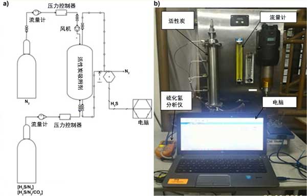 在設(shè)計為0.3米長的實驗室規(guī)模的單吸附塔單元中檢查六種活性炭對硫化氫的吸附性能。每種活性炭的高度指的是不同的活性炭載荷,分別為0.032kg,0.105kg和0.155kg。通過單次進(jìn)料H 2 S/N 2(1000 ppm H 2 S余量N 2)或H 2 S/N 2/CO 2(1000 ppm H 2)的混合氣體觀察吸附性能。圖1(A)和圖1(B)分別顯示了硫化氫吸附系統(tǒng)的示意圖和實際照片。
