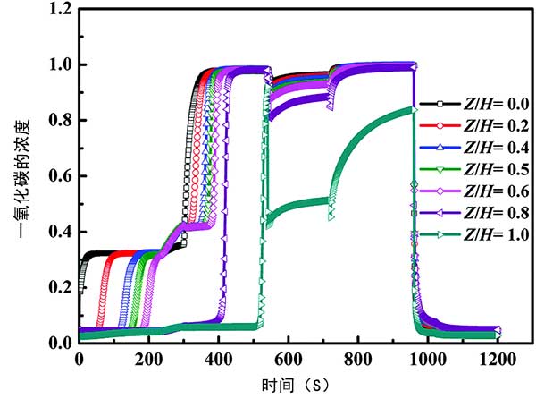 循環(huán)中活性炭床1上軸向CO濃度的變化在圖3顯示。在標(biāo)記為Z/H的吸附床中精確定位7個(gè)測量點(diǎn),分別為0.00,0.20,0.40,0.50,0.60,0.80和1.00,Z/H=0.00定義為吸附床的入口。從圖3中可以看出,在吸附步驟之后,吸附床處于Z/H=0.00-0.60達(dá)到CO吸附的飽和度。在ED步驟期間,一些雜質(zhì)氣體從吸附床排出,并且CO濃度略微增加。在更換步驟中,吸附床中的CO濃度逐漸增加,并且在更換步驟后,吸附床中的CO濃度高于98%,除了床出口,即在更換步驟結(jié)束時(shí),吸附床在Z/H=1.00時(shí),CO吸附飽和。因此,活性炭在合適條件下被充分利用。