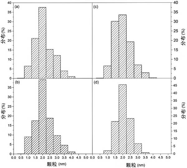 所有活性炭催化劑都顯示出高BET表面積。在二氯甲烷加氫脫氯中使用后沒有觀察到顯著差異,這消除了碳質(zhì)沉積物阻塞多孔結(jié)構(gòu)作為催化劑失活的原因。CO化學(xué)吸附結(jié)果表明,鉑在所有活性炭催化劑中均勻分散,它們之間略有不同。高Pt分散可歸因于活性炭的高表面積及其表面化學(xué)性質(zhì),這在催化劑制備過程中引起活性相與載體之間的相互作用。TEM圖像(圖1)和金屬粒度分布(圖2)證實(shí)了在鉑在兩種不同活性炭中形成Pt納米顆粒,平均尺寸值分別為1.6和2.0nm。
