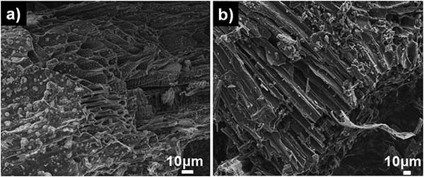 圖1:(a)未活化的活性炭和(b)活化后活性炭的SEM圖像。