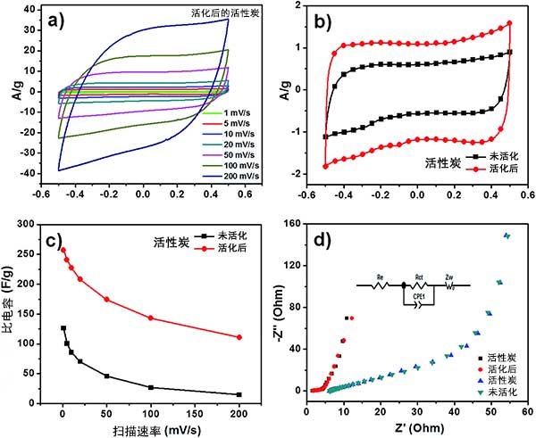 在不同掃描速率下觀察到兩種活性炭的準(zhǔn)矩形CV曲線(圖3a),這暗示了非理想的電容行為。我們還觀察到活化后的活性炭的CV環(huán)路較大,這意味著它具有比未活化的活性炭更大的電容(圖3b)。具體電容的總結(jié)如圖3c所示,活化后活性炭獲得的高電容為270,而沒(méi)活化的活性炭為125。這種高電容可歸因于諸如高表面積,分級(jí)孔徑分布和活性炭的表面潤(rùn)濕性等因素。對(duì)于兩種活性炭,由于電解質(zhì)不足以擴(kuò)散到電極材料的內(nèi)孔中而觀察到對(duì)應(yīng)于掃描速率增加的比電容的降低。