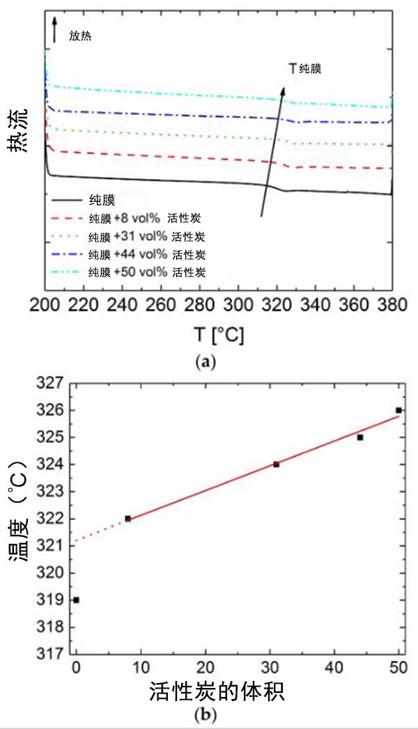 圖1:原始膜和加入活性炭后的混合基質(zhì)構(gòu)件(a)活性炭體積含量的函數(shù)的玻璃化轉(zhuǎn)變(b)。