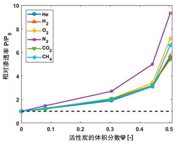 圖2:活性炭膜的滲透率與聚合物膜的滲透率之比作為活性炭體積分數(shù)的函數(shù)。