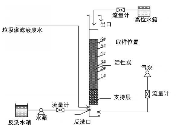 活性炭反應器工藝流程圖如圖1所示;钚蕴砍赜捎袡C玻璃制成,有機玻璃是柱式反應器;钚蕴砍馗叨葹2米。內(nèi)徑為63毫米。填充高度為1800毫米。碳層高度為1500毫米。砂濾器高度為300毫米。反應體積為4.7 L.有5個水取樣口和碳池。底部有曝氣器,碳池頂部有溢流堰。水質(zhì)分析指標為紫外分光光度法和紫外分光光度計。