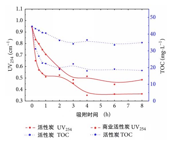 根據(jù)圖4,活性炭表現(xiàn)出良好的吸附生化水的性質(zhì)。UV254和TOC的濃度具有類似的變化趨勢。UV254和TOC的去除效率分別為63.0%和59.7%。商業(yè)活性炭的吸附性能較弱。UV254和TOC的去除率僅為52.9%和24.8%。商業(yè)活性炭的孔體積小于活性炭的孔體積。圖4中活性炭的UV254去除曲線分為兩個階段,它們分別對應于膜擴散和粒子擴散。