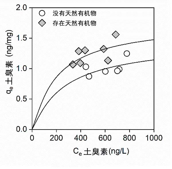 吸附平衡實驗進行60分鐘,這足以根據(jù)動力學研究達到吸附平衡。圖3顯示了在不存在和存在天然有機物質(zhì)的情況下土臭素在活性炭上的吸附等溫線。如圖2所示,在天然有機物質(zhì)存在下,吸附的土臭素的總量增加。這些結(jié)果意味著天然有機物質(zhì)可以增加活性炭的吸附位點。帶負電荷的天然有機物質(zhì)增加,因為電排斥力,從而增加了活性炭吸附能力。