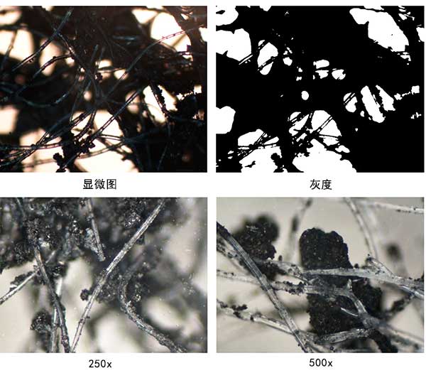 本期研究中的活性炭負載非織造過濾器由聚對苯二甲酸乙二醇酯和PET制成非織造布,并用粉末狀活性炭浸漬而成。使用光學顯微鏡來評估活性炭纖維直徑分布和光學與活性炭介質的密度;钚蕴康男螒B(tài)顯示在光學顯微鏡圖像中(圖1)。觀察到在纏結的聚合物纖維之間的空間中聚集的粉末狀碳材料的大量聚集。尺寸不超過纖維直徑的團塊以較小的量存在。它們附著在基本纖維上但未嵌入其結構中,這很重要,因為碳吸附劑在非織造結構中的沉積會顯著影響材料的吸附性能。這是因為在聚合物材料中存在結合物質或嵌入碳顆?赡軐е挛⒖鬃枞,從而限制了活性炭材料的最終產能。接下來,我們應用了例程,對于給定的灰度圖像,它確定由黑色像素簇覆蓋的整個灰度圖像的分數。該方法允許我們粗略地評估活性炭復合材料中活性炭團聚的均勻性,而不考慮基礎非織造材料的不均勻性,因為這個例程省略了透明PET纖維。