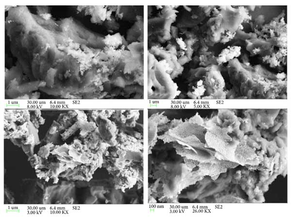 掃描電子顯微鏡分析:SEM研究證實(shí)了氧化鋅在活性炭載體上的負(fù)載,圖1示出了活性炭的SEM圖像。可以看出,活性炭呈細(xì)孔的不規(guī)則圖案。另外,氧化鋅顆粒沉積在活性炭的表面和孔中。仔細(xì)觀察表明活性炭表面上的片狀氧化鋅結(jié)構(gòu)。
