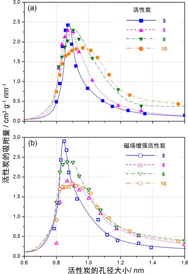 從煤焦油和瀝青制備活性炭的微孔分布,從所獲得的吸附等溫線,在圖3兩種活性炭的孔徑差異非常小相差不到0.04nm,并且在兩種情況下大多數(shù)孔分布在0.80和0.95nm之間。然而,觀察到由磁場增強過的活性炭吸附量在該區(qū)域中大大增加。從吸附等溫線可以估計0.8至0.95nm范圍內的總吸附量約為1.25倍。當活化劑量加大時兩種活性炭的孔徑分布均發(fā)生變化,產(chǎn)生了略大的孔隙結構。