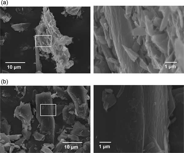 我們預測磁場對活性炭微孔形成機制的差異。在施加的磁場下,由于取向的碳聚結,碳六邊形沿磁場方向形成,這種效應導致沒有邊界的結構。結果,由于微晶與磁場的排列,在活化過程中化學品不容易進入晶間和碳間六角層。涉及金屬活化劑滲透到炭微晶中,破壞六邊形結構以形成炭的邊緣表面和嵌入活性炭中間層的化學物質。活性炭的掃描電子顯微鏡(SEM)圖像顯示在圖4中;钚蕴吭跊]磁場的情況下,圖像大多數(shù)顯示出片狀結構。然而,活性炭在高磁場的情況下,圖像大多數(shù)顯示出塊形態(tài)。即使在觀察活性炭堆積平面的橫截面時,后者也顯示出比前者更清潔的橫截面,并保留了反映前體的有序結構;罨瘎┑谋嚷什煌瑫䦟е,活性炭形成微孔的大小。在活化劑和前體材料比率為3時,微孔數(shù)量的增加率較大。然而,在活化劑和前體材料比率為5時,微孔和相對大的孔隙之間的關系被逆轉。