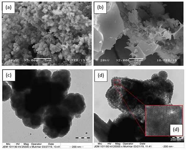 使用SEM,TEM,TGA和XRD分析活性炭的表面形態(tài),熱性質(zhì)和結(jié)晶度。用作活性炭前體的圖像(圖1a,c)顯示其典型的形態(tài)為花椰菜樣結(jié)構(gòu),這種形態(tài)似乎是由于與其中摻雜地嵌入無序聚合鏈形成的。然而,聚吡咯的球形結(jié)構(gòu)通過碳化過程被破壞,導(dǎo)致粗糙,粗糙的表面由不規(guī)則的尖角和剝離狀顆粒組成,在SEM圖像中幾乎沒有孔隙的跡象;钚蕴烤圻量┑腡EM圖像如圖1d所示表示觀察到均勻分布的微孔。此外,TEM圖像描繪了高度豐富和對稱的孔隙,表面積和微孔率的值對應(yīng)于該活性炭。發(fā)現(xiàn)隨著活化劑用量的增加,表面積增加,孔隙率增加。