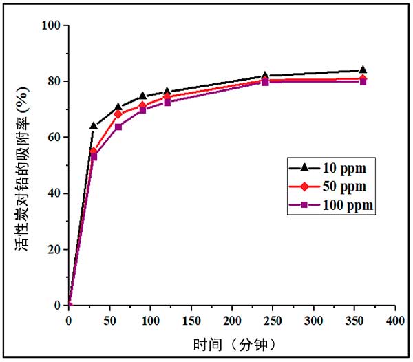圖2:在三種不同濃度下,活性炭對鉛離子的吸附百分比與時間的關(guān)系。
