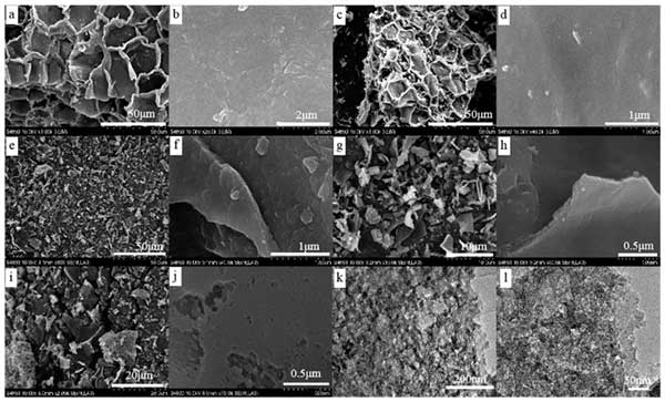 通過SEM和TEM研究了空氣氧化前后活性炭的微觀結(jié)構(gòu)(圖2)。在(圖2a,b)中,軟木材料呈蜂窩狀結(jié)構(gòu)并具有明顯的褶皺。在800℃碳化后,保留結(jié)構(gòu)并且包含該結(jié)構(gòu)的部分彼此緊密結(jié)合,看起來光滑(圖2c,d)。在350℃-450℃下空氣活化后,結(jié)構(gòu)單元被分離形成薄片(圖2e),這可歸因于細(xì)胞之間木質(zhì)素的降解。活性炭呈現(xiàn)出層狀空氣氧化后的結(jié)構(gòu)(圖2的e-j)的。350℃和400℃活化的活性炭樣品表面相對光滑,在0.5-1μm的分辨率下未觀察到明顯的孔結(jié)構(gòu)(圖2f,h)。當(dāng)氧化溫度升至450℃時,活性炭的表面顯著變化并觀察到大量的孔。圖2j顯示450℃活化樣品顯示出具有裂縫和空隙的粗糙表面。TEM結(jié)果(圖2k,i)顯示450℃活化的活性炭具有三維(3D)互連框架的分級微/中孔結(jié)構(gòu)。這些孔可以有助于廢水中染料的吸附。