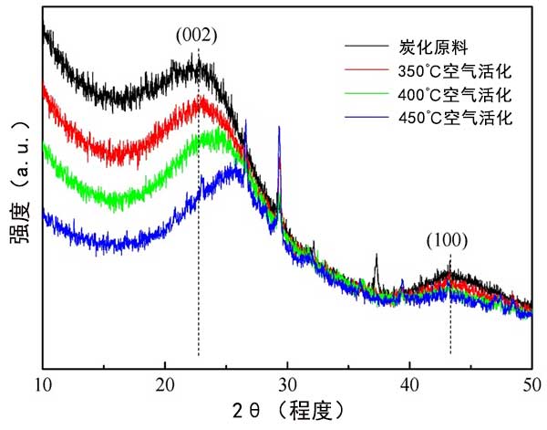 圖3顯示了空氣氧化之前和之后活性炭的XRD圖譜。所有樣品在~24°處顯示典型的寬峰,在~43°處顯示弱峰,分別對應(yīng)于石墨碳的(002)和(100)平面。所有樣品的寬峰和弱峰反映了活性炭的低度石墨化。與炭化原材料相比,隨著氧化溫度的升高,(002)峰逐漸向較高角度移動。該運(yùn)動表明空氣氧化后石墨結(jié)構(gòu)中(002)晶面的d-空間減小。結(jié)果表明,活性炭的空氣活化導(dǎo)致石墨結(jié)構(gòu)具有改善的致密性。