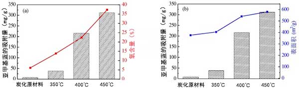 活性炭的空氣活化產(chǎn)生更多的分層孔結(jié)構(gòu),具有更高的表面積和更豐富的表面官能團(tuán)。更多數(shù)量的孔納米結(jié)構(gòu)可為染料分子提供大量吸附位點(diǎn)并改善其吸附能力。富含表面的官能團(tuán)可促進(jìn)活性炭在水中的分散,使活性炭在吸附過程中與染料完全接觸。這些性質(zhì)在空氣活化后賦予活性炭較好的亞甲基藍(lán)吸附性。在300℃至450℃的溫度下空氣活化后,盡管由于350℃活化導(dǎo)致的表面積略微增,但吸附容量是炭化原料的4.8倍。這種情況表明,表面積在提高空氣活化后活性炭的吸附能力方面起著次要作用。表面性質(zhì)的變化可能主要影響空氣活化后活性炭的吸附性能。結(jié)果得到了亞甲基藍(lán)吸附容量與受空氣活化溫度影響的活性炭表面積和氧含量的相關(guān)性的支持(圖7)。亞甲基藍(lán)的改善的吸附性能與與活化溫度相關(guān)的氧含量的變化趨勢很好地對應(yīng)(圖7a)。而隨著活化溫度的升高,吸附容量的增長率遠(yuǎn)高于表面積(圖4b)。