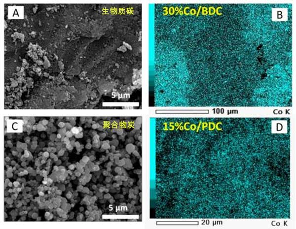 使用掃描電子顯微鏡(SEM)觀察由植物殼和酚醛樹脂的熱解獲得的活性炭的表面形態(tài),并分別在圖1A,C中示出?梢钥闯觯煌奶记绑w產(chǎn)生不同的表面形態(tài)。生物質(zhì)衍生的碳顯示出剛性和致密的結(jié)構(gòu),這是典型的木炭特征。而聚合物衍生的碳呈現(xiàn)具有粒子網(wǎng)絡(luò)的碳球,在球體之間產(chǎn)生大的空隙。然后將兩種活性炭用作氧化鈷的載體。為了觀察金屬氧化物在活性炭上的分散,進(jìn)行了SEM與能量色散X射線(EDX)的元素映射。圖1B,D表示裝載在兩種材料中的氧化鈷的代表。所有都顯示鈷材料(在青色中顯示)在活性炭中的均勻分散。這表明通過浸漬方法中描述的簡單化學(xué)計量計算很好地實現(xiàn)了元素鈷的目標(biāo)負(fù)載。換句話說,上述結(jié)果清楚地顯示了制備氧化鈷活性炭的成功制備步驟。