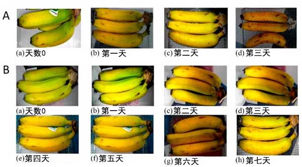 圖3A,B分別顯示了在沒有和使用氧化鈷浸漬的活性炭在封閉存儲期間的水果條件的日常記錄。使用活性炭15%氧化鈷材料,進(jìn)行半定量檢查(即顏色和棕色區(qū)域)。當(dāng)棕色主要出現(xiàn)時,長期保存時間被定義,并且香蕉從束中掉出來。當(dāng)將香蕉存放在沒有活性炭吸附劑的封閉盒子中時,水果很快變得腐爛。僅在第三天,一束香蕉已經(jīng)從束中掉出來并出現(xiàn)棕色斑點。使用活性炭吸附劑情況下,可以清楚地看到水果保存時間的延長。相對于沒有活性炭,顏色的變化被延遲(圖3B)。結(jié)果表明氧化鈷浸漬的活性炭作為乙烯清除劑在儲存系統(tǒng)中的效果,因此延長了水果的儲存壽命。