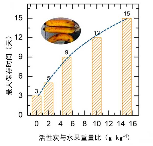 為了研究活性炭用量的影響,改變了活性炭和水果的質(zhì)量比。圖4顯示了活性炭與水果的保存時間與質(zhì)量比的范圍為;钚蕴康牧繒绊懕Y|(zhì)期,并且可以看到非線性相關(guān)性(見圖4中的虛線)。沒有活性炭達(dá)到存在,水果儲存時間僅為3天。根據(jù)添加的活性炭的質(zhì)量,保質(zhì)期可以從2天延長至12天。通過添加15克吸附劑用于1千克水果,可以實現(xiàn)延長高達(dá)5倍的保質(zhì)期。較高質(zhì)量的活性炭提供較長的保存時間,這可能是由乙烯吸附的活性位點含量較高引起的。結(jié)果表明,氧化鈷浸漬的活性炭有望用于延長水果的保質(zhì)期。
