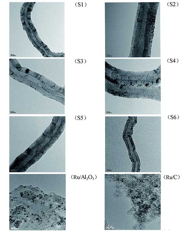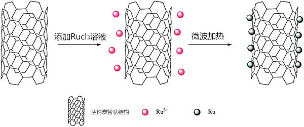 所有載釕活性炭上的釕負載量理論上為5%。通常,將活性炭加入120mL乙二醇中。并將混合物在超聲處理30分鐘以確保活性炭均勻分散。超聲處理后,在連續(xù)攪拌下滴加3.0mL RuCl 3水溶液30分鐘。然后是使用NaOH乙二醇溶液將混合物的pH調(diào)節(jié)至4.0。然后,在連續(xù)攪拌24小時后,將溶液放入微波合成反應(yīng)器中加熱100秒。過濾混合物溶液,用去離子水洗滌直至濾液的pH達到7.0,并在80℃下真空干燥。將樣品研磨成粉末使用。由于活性炭的表面是疏水的,它們傾向于在極性溶劑中聚集。并且由官能團改性的活性炭可以提供足夠的孔隙以使釕納米顆粒均勻地分布在活性炭的表面上。在通過微波加熱的多元醇方法制備活性炭負載的釕納米顆粒。合成過程如圖1所示。