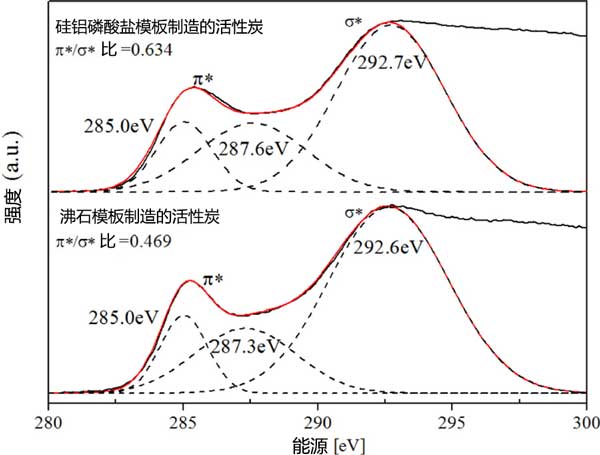 兩種模板化制造活性炭的EELS光譜在圖3顯示。這兩條曲線的sp 2/sp 3碳的分?jǐn)?shù)已經(jīng)顯示出與碳原子的雜化有關(guān),并且一系列高斯峰被擬合到下的去卷積。定量計算表明,硅鋁磷酸鹽模板化活性炭的光譜在兩個峰之間具有統(tǒng)計學(xué)上更高的比率,與無定形碳相比,這兩種活性炭的sp 2/sp 3碳具有更高比例。