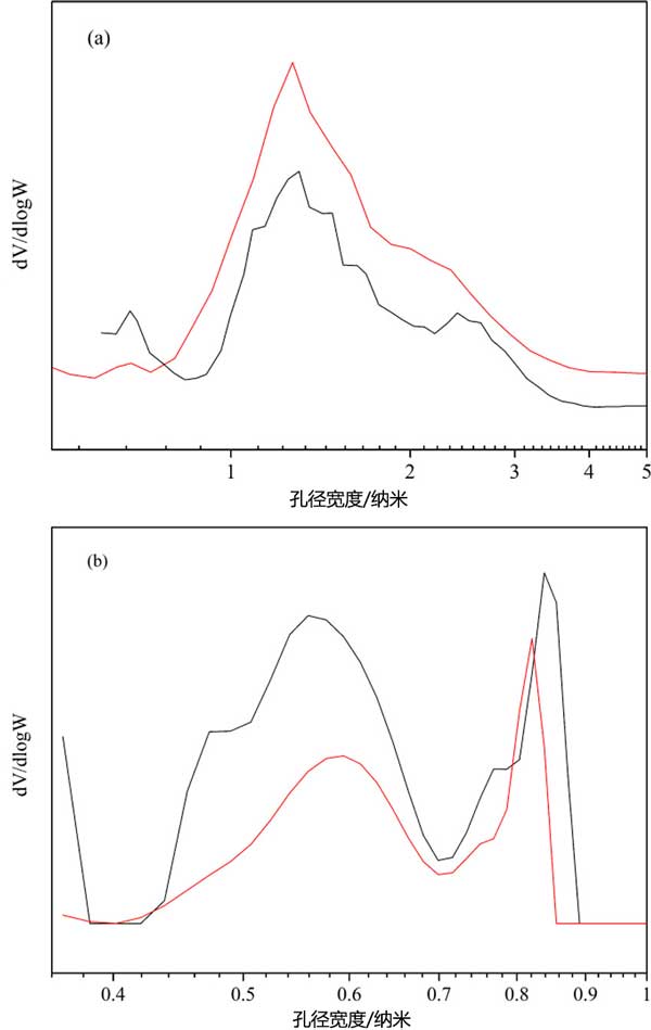 圖4:(a)在-196℃下記錄的氮吸附數(shù)據(jù)和(b)在0℃下記錄的二氧化碳吸附數(shù)據(jù)計算的活性炭孔徑分布。
