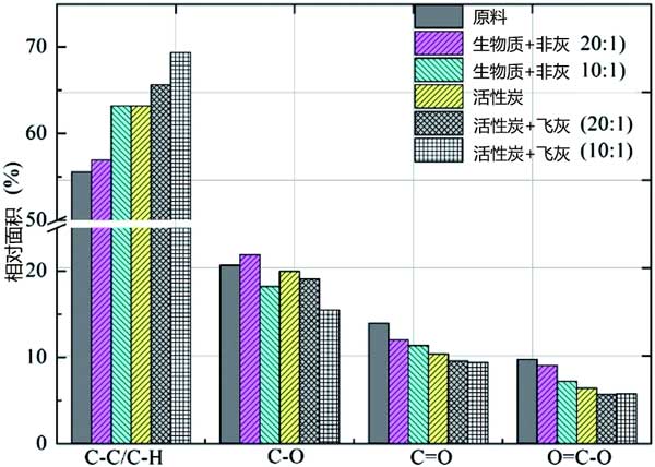表面基團(tuán)的芳香族C-C或C-H隨著活性炭原料在熱解時(shí)的比例增加以及氣體活化而增加可以從圖2中可以看出。這是預(yù)期的,在不完全燃燒和部分氧化可導(dǎo)致在含碳材料內(nèi)形成芳族化合物。含氧官能團(tuán)如C-O,C=O和O.=隨著生物炭和活性炭的煤飛灰比例增加,C-O的相對面積減小。煤飛灰似乎提高了芳構(gòu)化程度,但顯著降低了羰基的相對濃度,同時(shí)保持或適度降低了酮和羧酸的性質(zhì)。這可能涉及先前發(fā)現(xiàn)的用于生物質(zhì)和煤飛灰的共熱解的生物燃料的增強(qiáng)的脫氧,并且表明活性炭的表面化學(xué)可以使用煤飛灰作為添加劑來介導(dǎo)。